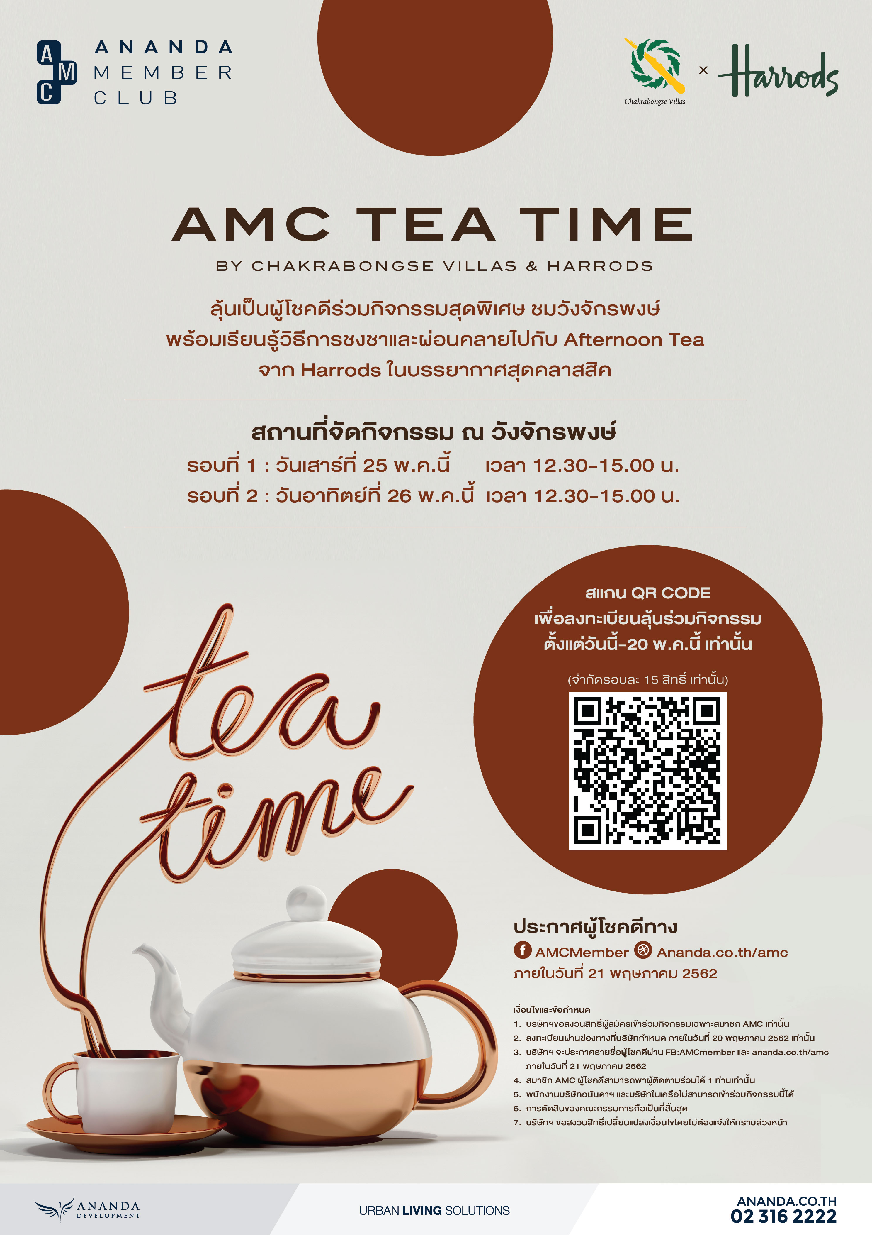 ลุ้นเป็นผู้โชคดีร่วมกิจกรรมสุดพิเศษ ชมวังจักรพงษ์ พร้อมเรียนรู้วิธีการชงชาและผ่อนคลายไปกับ Afternoon Tea ยามบ่ายจาก Harrods ในบรรยากาศสุดคลาสสิค เพียงแสกน QR Code เพื่อลงทะเบียนลุ้นเข้าร่วมกิจกรรม ตั้งแต่วันนี้ถึงวันที่ 20 พฤษภาคม 2562 นี้ (สามารถลงทะเบียนได้ 1 รอบต่อ 1 สิทธิ์สมาชิก AMC เท่านั้น)