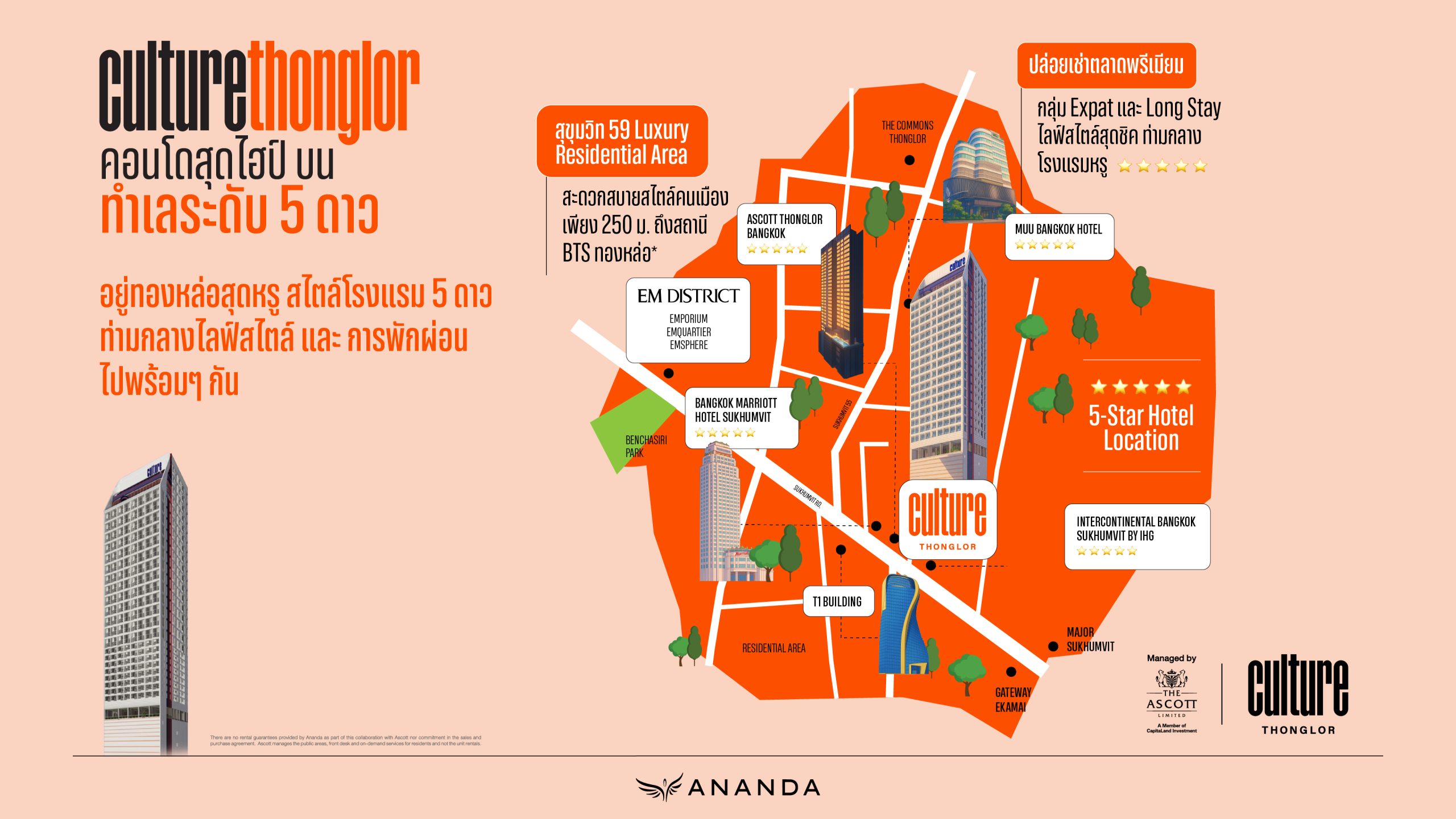 อย่างโปรเจคที่ติดกับเราเลยก็คือ The Ascott Thonglor Bangkok หรือหน้าซอยสุขุมวิท 59 ก็มีโรงแรม InterContinental Bangkok Sukhumvit ถัดไปอีกนิดก็มี Bangkok Marriott Hotel Sukhumvit หรือซอยข้างๆ ก็จะเป็นโรงแรม The Okura Prestige Bangkok จะเห็นได้ว่า Culture Thonglor เป็นคอนโดที่รายล้อมไปด้วยโรงแรมระดับ 5 ดาว หลายแห่งเลยครับ