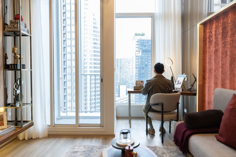 ด้านในสุดของห้องจะเป็นประตูเชื่อมต่อไปยังระเบียงครับ สามารถเปิดออกไปเพื่อรับอากาศดีๆ ในช่วงนี้ได้ และยังมีพื้นที่อีกส่วนหนึ่ง ที่สามารถวางเป็นโต๊ะทำงานได้อย่างลงตัว ทำงานไป ชมวิวเมืองไปด้วย ก็ช่วยให้การคิดโปรเจ็กต์ใหม่ๆ ได้ง่ายขึ้นครับ