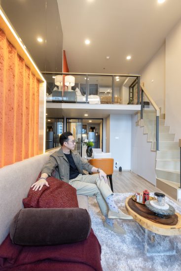 ถัดมาเป็นโซนนั่งเล่นแบบ Double Volume เพดานสูง 4.3 เมตร* ที่ให้ความรู้สึกโปร่ง โล่ง พร้อมทั้งกระจกบานใหญ่ริมหน้าต่าง ที่ช่วยเสริมความรู้สึกสบายๆ ให้การอยู่อาศัยอีกด้วย