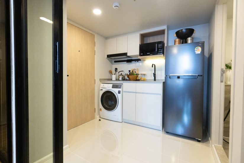 เริ่มที่ห้องแรกกันครับ 1 Bedroom Hybrid ขนาด 32.5 ตารางเมตร (พื้นที่ใช้สอยรวมชั้นลอย 45 ตร.ม.) ห้องนี้บอกเลยว่าฮอตสุดๆ ส่วนตัวพี่คิดว่าเลย์เอาท์ของห้องออกแบบมาได้อย่างดีมากๆ แบ่งโซนการใช้งานห้องได้อย่างชัดเจน อย่างส่วนแรกที่เป็นครัว ก็ทำเป็นครัวปิดกั้นประตูไว้มิดชิด เหมาะสำหรับสายชอบทำอาหารเป็นที่สุคดรับ