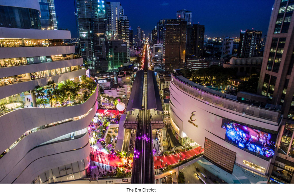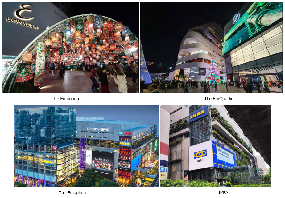 The Em District ที่ประกอบด้วย 3 ห้างดัง The Emporium, The EmQuartier และ The Emsphere ซึ่งเรียกได้ว่าเป็น Shopping Hub ใจกลางเมืองที่รวมเอาร้านแบรนด์ชั้นนำระดับโลกไว้ครบเกือบทุกประเภท ทั้งแฟชั่น ลักชัวรี Gadget และสินค้าไลฟ์สไตล์ต่างๆ และอีกหลายแบรนด์ที่มาเปิด Shop แบบ Official Store เต็มรูปแบบ