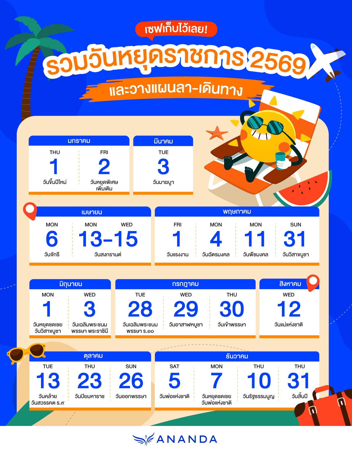 - ตรวจสอบวันหยุดราชการล่วงหน้า: เริ่มต้นโดยพิจารณากำหนดการวันหยุดราชการในปี 2569 และเลือกวันหยุดที่อยู่ติดวันหยุดสุดสัปดาห์เพื่อเพิ่มวันหยุดยาว