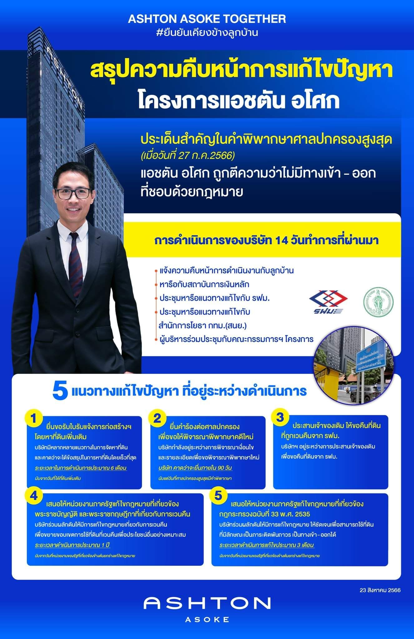 บริษัทฯ โดยคุณชานนท์ ได้มีการแจ้งความคืบหน้าในการดำเนินงาน ตาม 5 แนวทางเพื่อการแก้ไข ปัญหาเรื่องทางเข้า-ออกโครงการแอชตัน อโศกผ่านทางวีดีโอแล้ว เมื่อวันที่ 23 สิงหาคม 2566 ที่ผ่านมา หากท่านเจ้าของร่วมมีคำถามเพิ่มเติม สามารถติดต่อผ่านทางนิติบุคคลฯ หรือ คณะกรรมการฯ โดยแจ้งความประสงค์ผ่านทางคุณปิยะวรรณ เหล่าสัมฤทธิ์ ซึ่งเป็นตัวแทนผู้บริหารของบริษัทฯ ในการประสานงาน