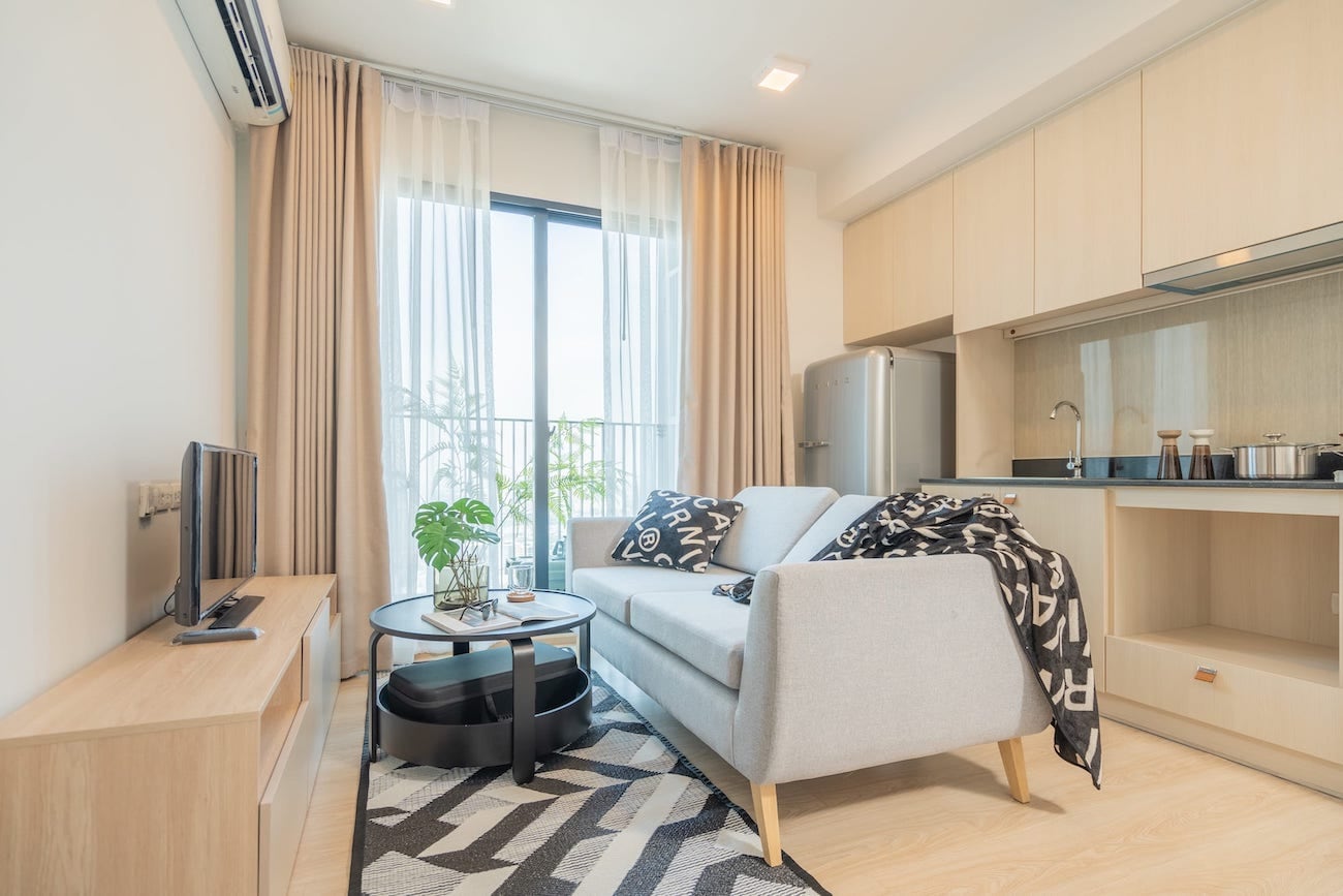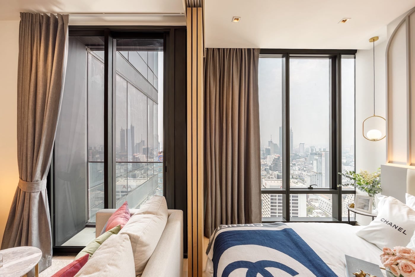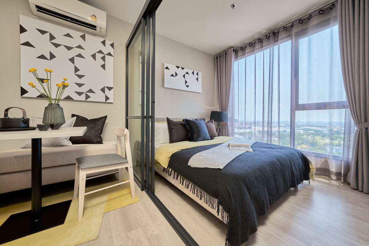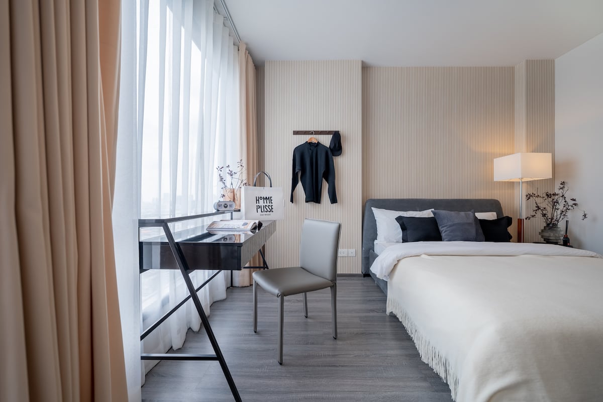 IDEO Q VICTORYConcept:BRANDED SIGNATURE COLLECTIONห้องที่ตกแต่งอย่างมีสไตล์ เล่นกับโทนสีสว่าง พร้อมด้วยกระจกโค้งบานใหญ่ พร้อมระเบียงหน้ากว้างให้ความรู้สึกเหมือนใช้ชีวิตที่ sky villa สามารถเทควิวได้มุมกว้าง ช่วยทำให้เกิดความรู้สึกที่สะอาด ปลอดภัย มีความเรียบง่ายและสบายตา